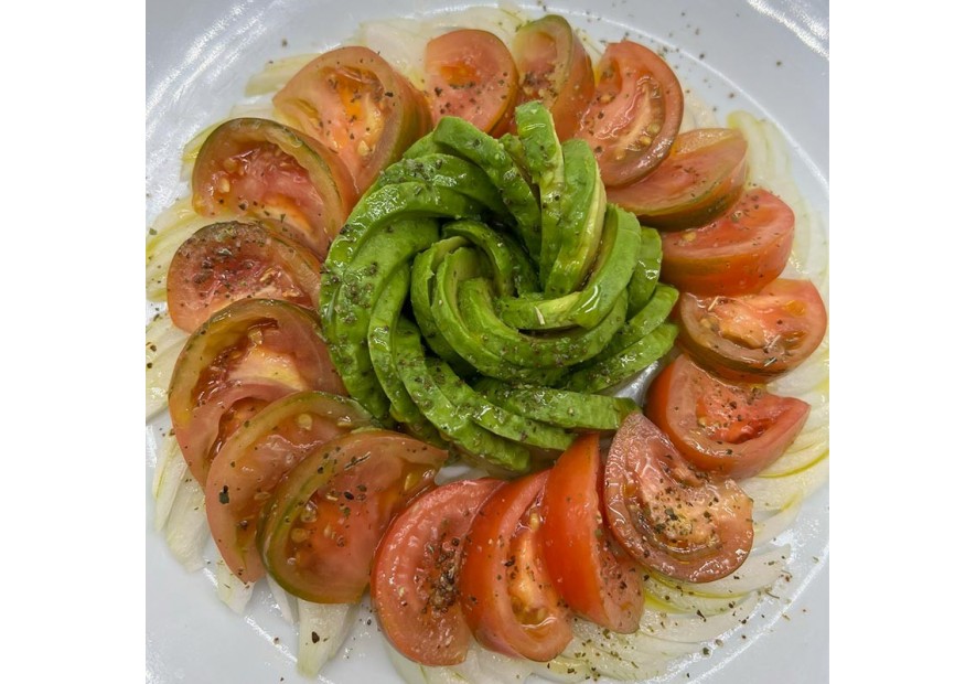 - Ponemos la cebolla alrededor del aguacate y en el mismo sentido, hacemos lo mismo con las rodajas de tomate.
