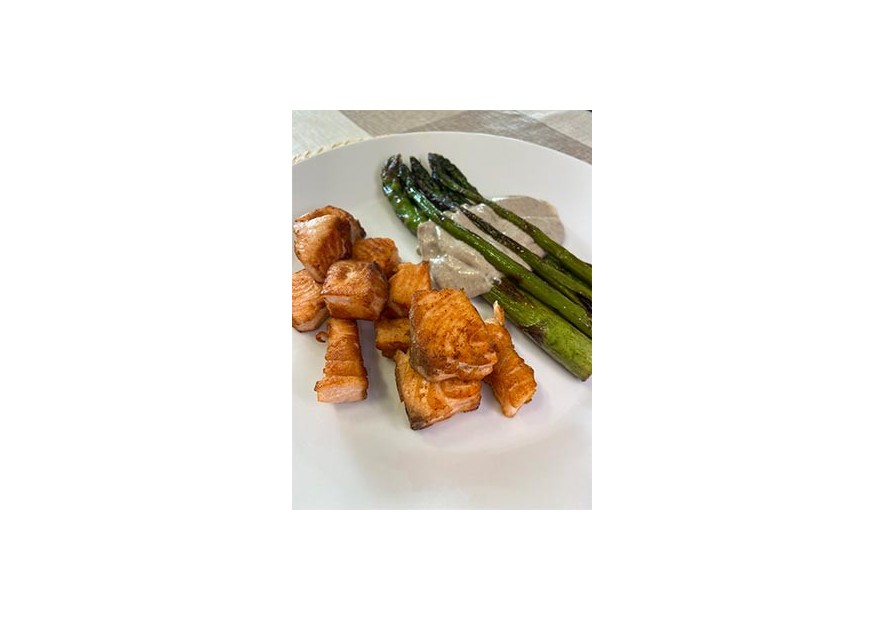 - En otra sartén pones las piezas de salmón para que se hagan un poco por ambos lados, puedes servir la pieza entera o cortarla a dados y dorarlos por ambos lados.