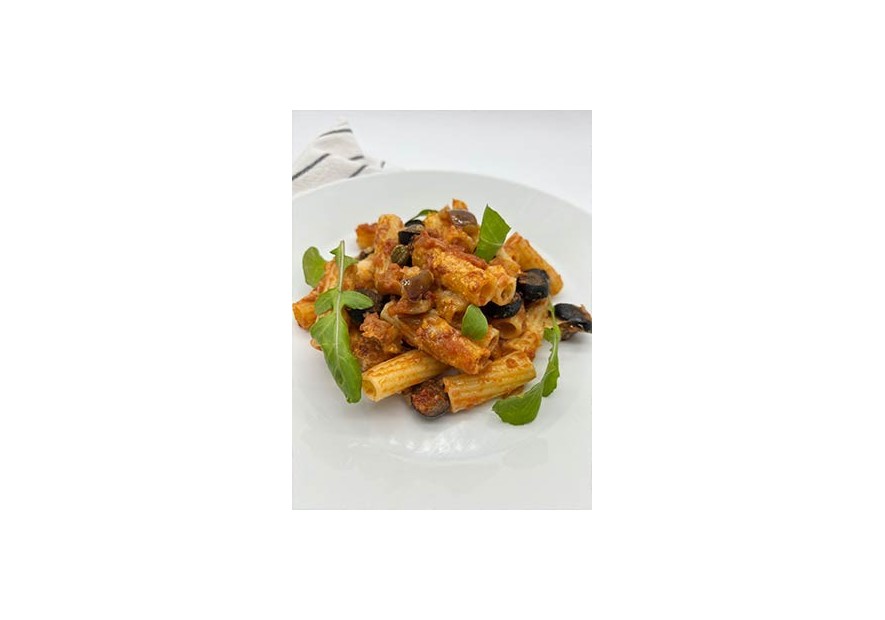 - Escurra las alcaparras, las aceitunas y las anchoas, las dos últimas las cortas en trozos, añade todo a la sartén del tomate, mezcle y añade al recipiente para horno junto con la pasta.