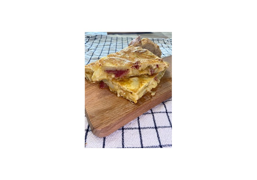 - Añade una mitad a la sartén, pon encima el queso y el jamón y añade la otra mitad de huevo y patatas.