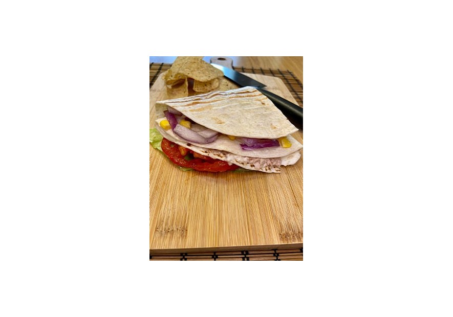 - Cortamos la tortilla desde el centro hacia un extremo y comenzamos a montar el Wrap.