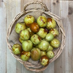 Su color es amarillo verdoso y se va convirtiendo en granate con la maduración, su piel es fina y cruje al morderlos, su carne es dulce y harinosa, cuanto más maduro este el fruto, más tierno y dulzón resulta.
